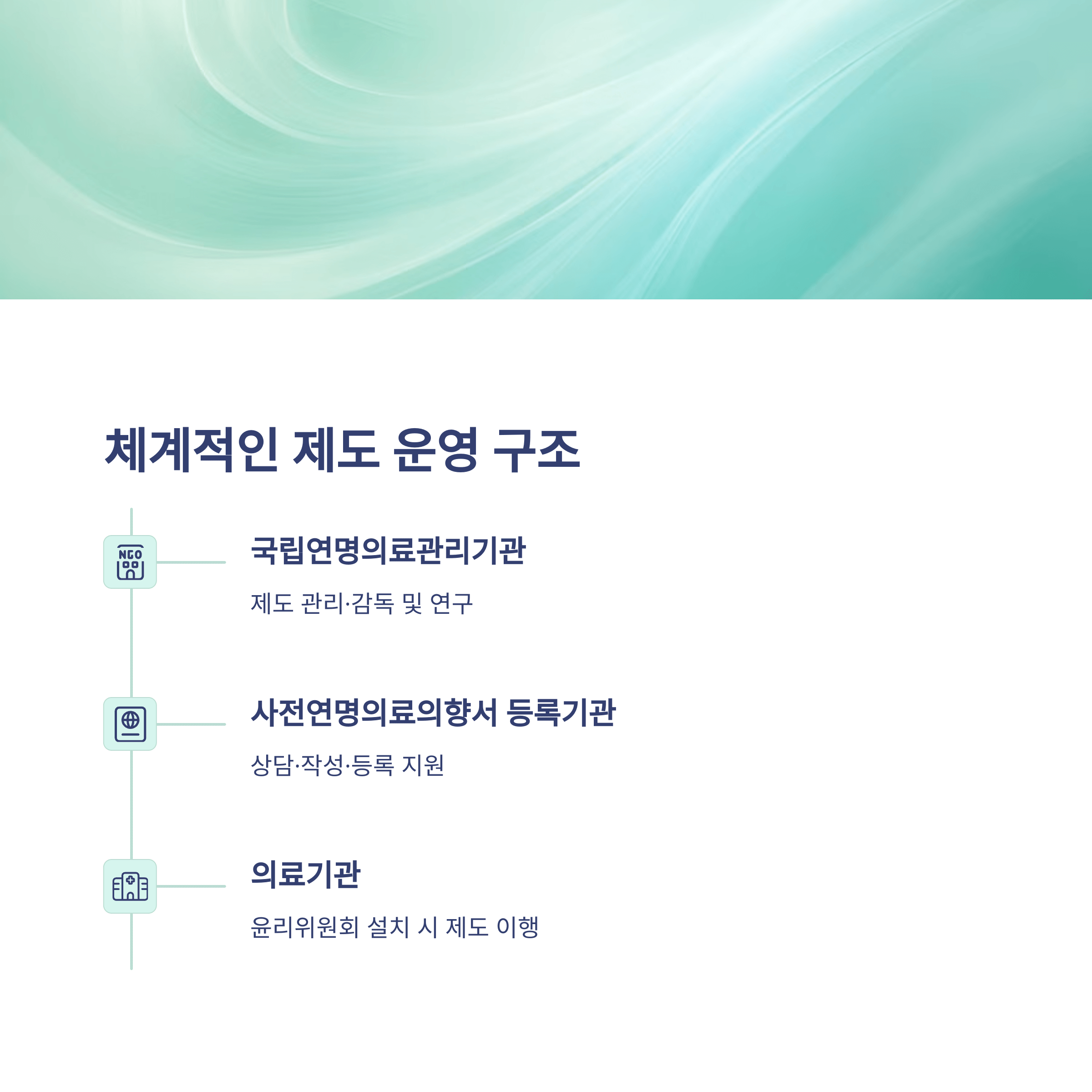 삶의 마지막을 스스로 결정할 수 있는 기회를 제공하고, 의료기관과 등록기관을 관리하며 공정하고 투명한 제도 운영을 담당합니다.